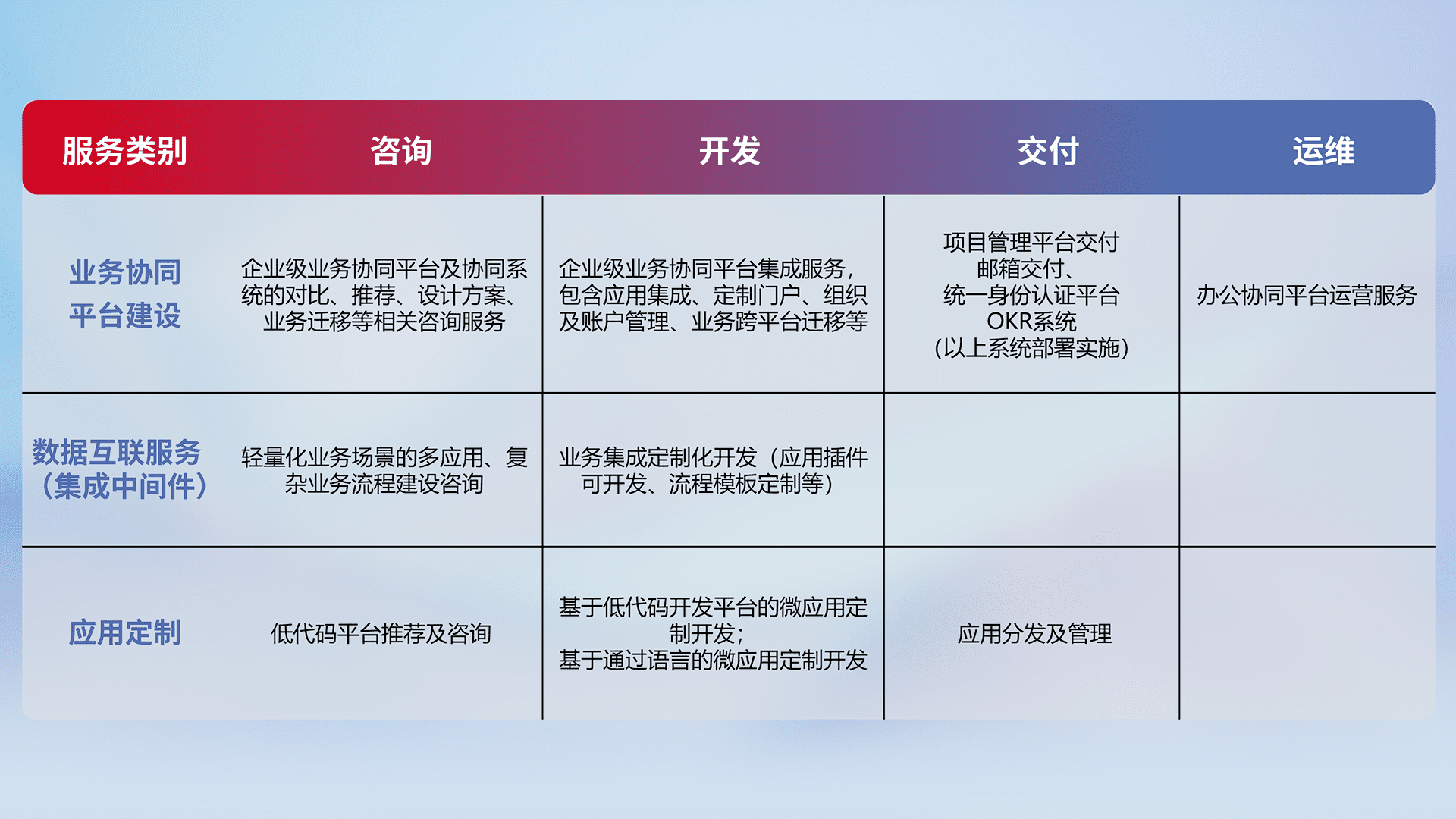 针对钉钉、、企微、、、IDaas等平台级产品提供产品的规划、、、方案、、、交付、、定制化开发等服务,,实现如统一协同办公、、、智能客户服务、、、、混合会议管理、、、、智能数据查询、、等业务场景,,实现数字化转型。。